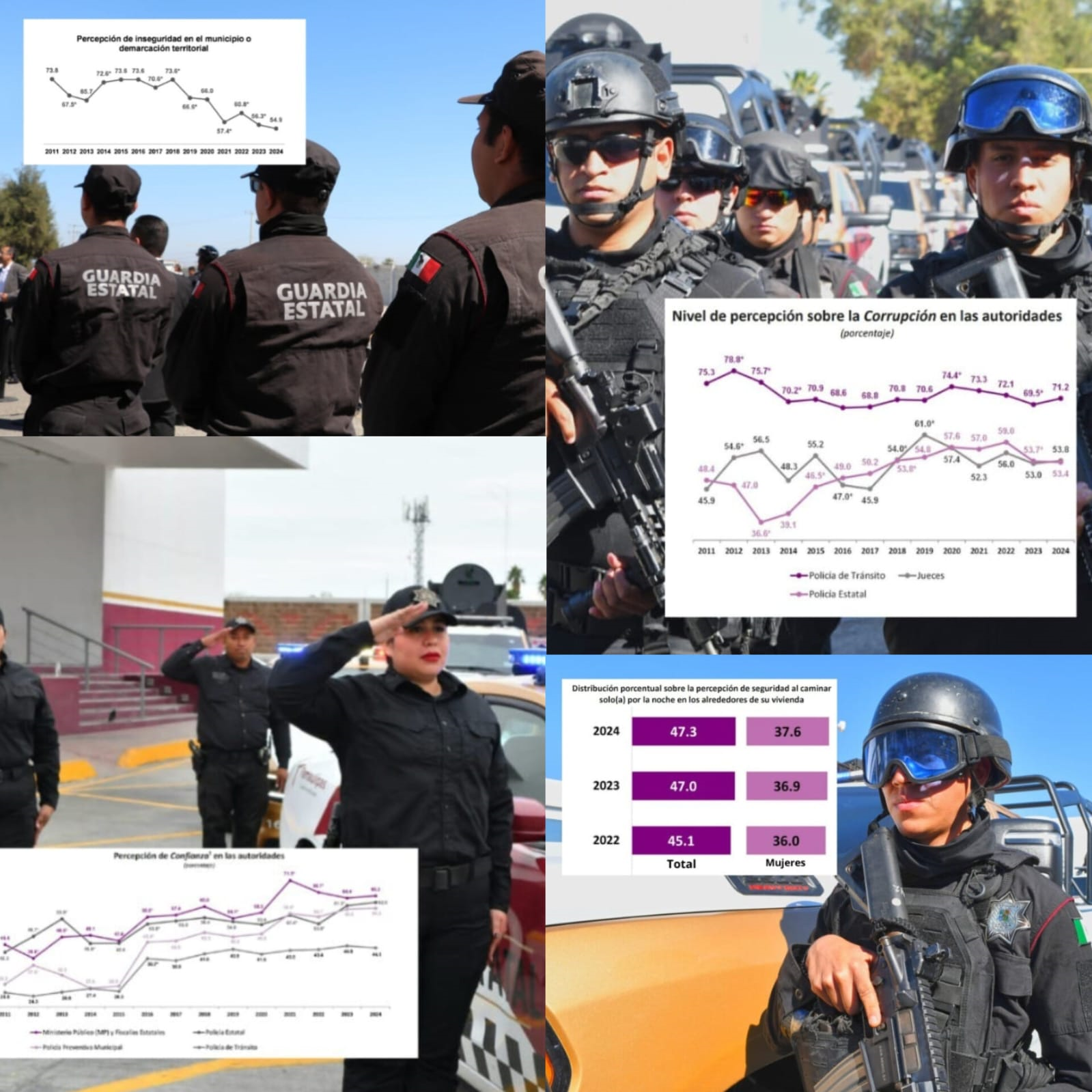 La misma señala que, en el 2022 la percepción de confianza en la entonces Policía Estatal era de un 53.8% mientras que, en el 2023 aumentó a un 61.3% y en el 2024 alcanzó los 62.6 puntos porcentuales.