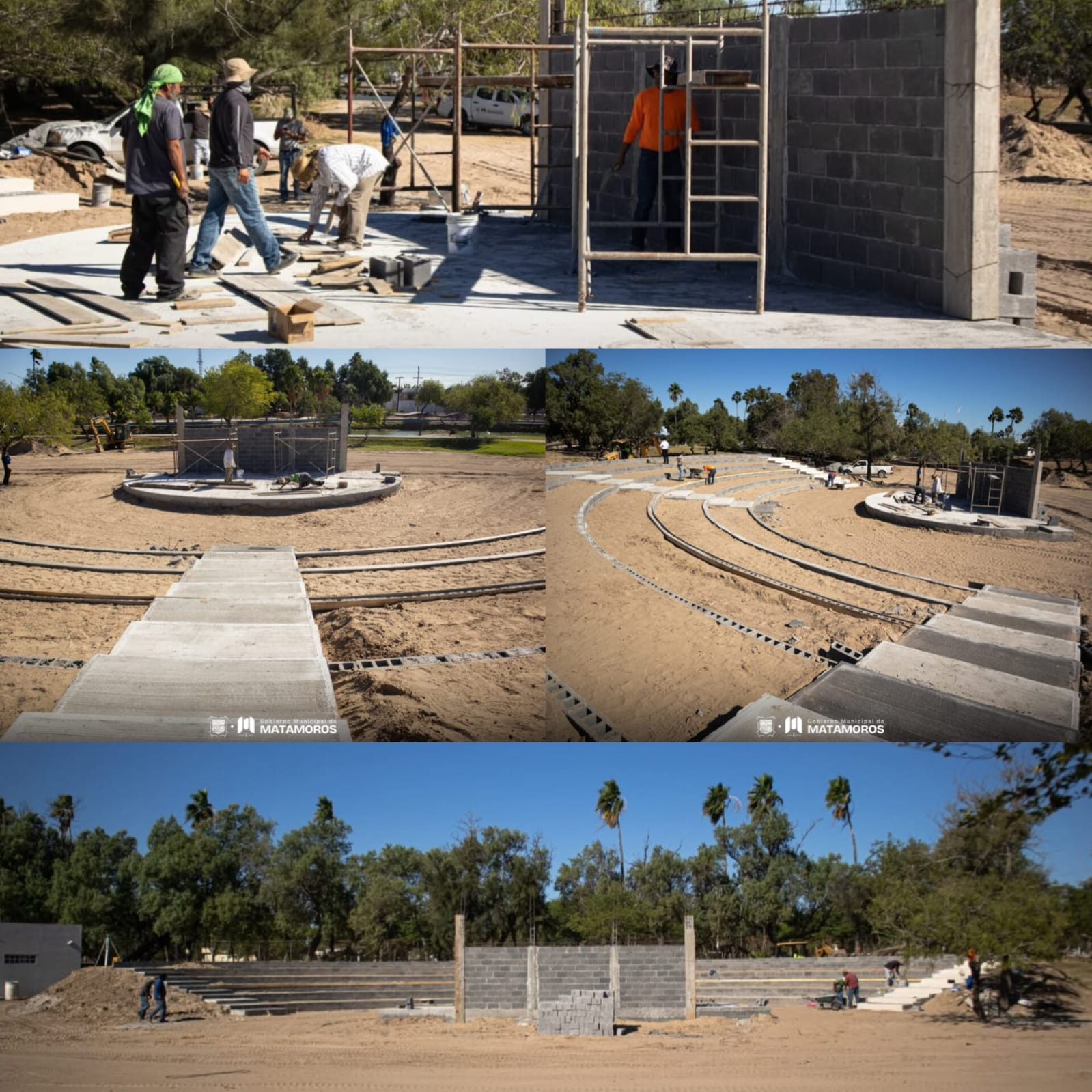H. Matamoros, Tamaulipas.- El Gobierno Municipal que encabeza Beto Granados continúa avanzando en la transformación de los espacios públicos de Matamoros, demostrando su compromiso con el bienestar y la convivencia de las familias. Uno de los proyectos más destacados es la construcción del Cinema al Aire Libre en el Parque Niños Héroes “El Laguito”, donde ya se pueden apreciar importantes avances en su desarrollo.