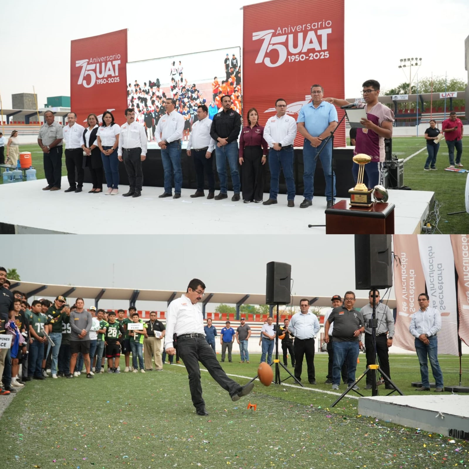 El rector de la Universidad Autónoma de Tamaulipas, Dámaso Anaya Alvarado, inauguró la tarde de este jueves el torneo número 44 de la Liga Universitaria de Futbol Americano de la UAT (LUFAUAT) categoría intermedia y juvenil AA.