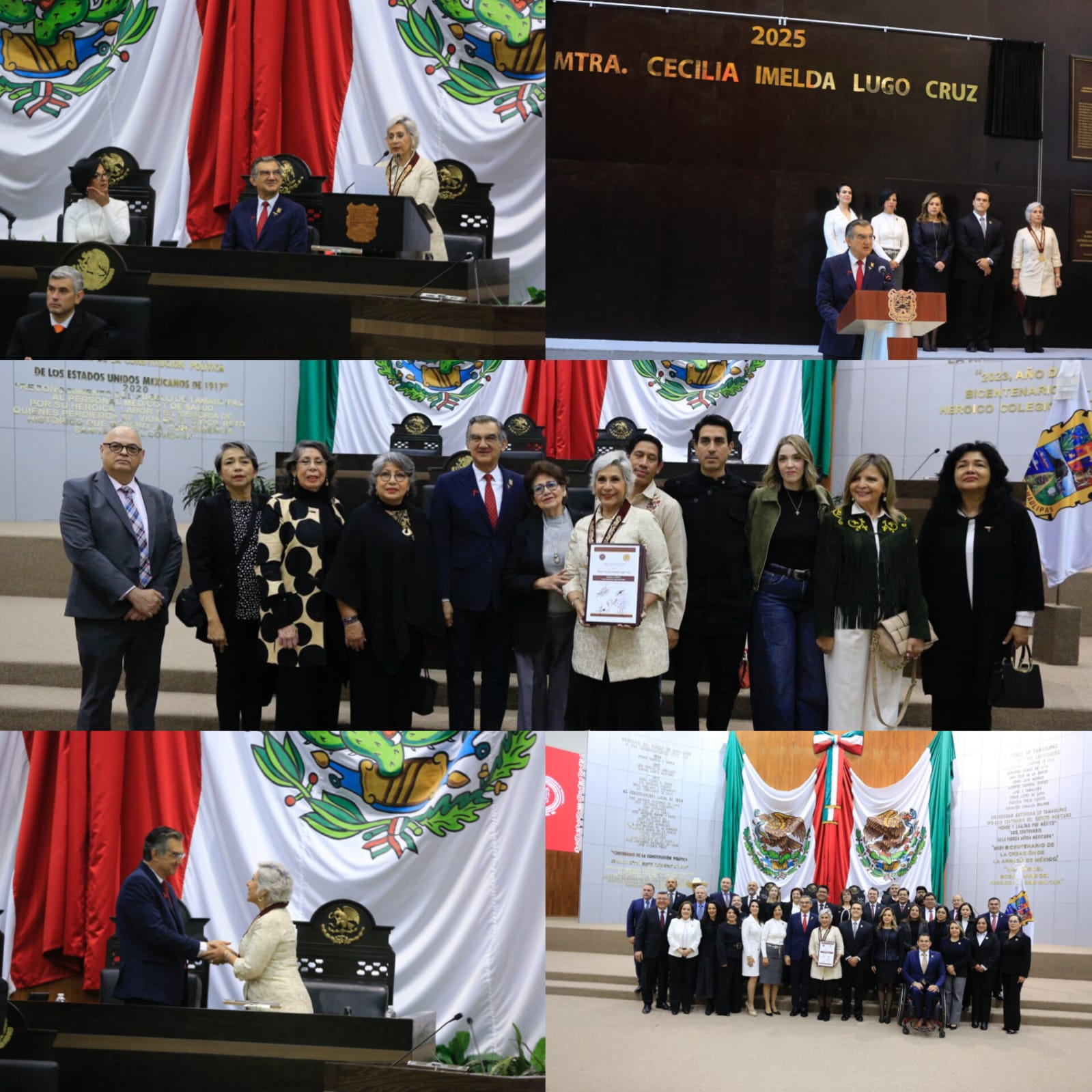 Ciudad Victoria, Tamaulipas.– El gobernador Américo Villarreal Anaya entregó la Medalla al Mérito “Luis García de Arellano” a la maestra tampiqueña Cecilia Imelda Lugo Cruz y develó su nombre con letras doradas en el Muro de Honor del Congreso del Estado, como un justo reconocimiento por su trayectoria profesional y ejemplar en la danza, la literatura, el teatro y la poesía, además de ser una destacada bailarina coreógrafa, gestora cultural, y una figura emblemática de la escena dancística nacional.