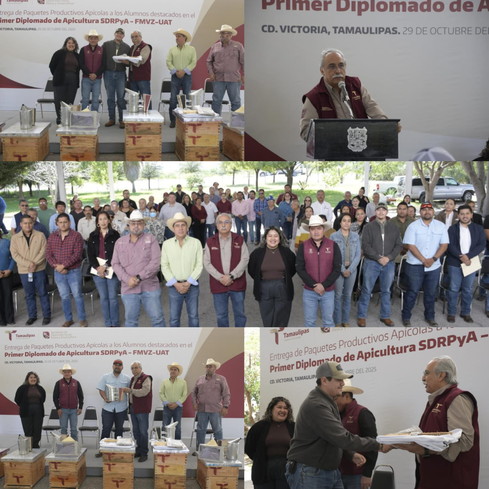 Ciudad Victoria, Tamaulipas. – Como parte del programa Fomento a la Apicultura, la Secretaría de Desarrollo Rural, Pesca y Acuacultura del Gobierno del Estado de Tamaulipas, en coordinación con la Facultad de Medicina Veterinaria y Zootecnia (FMVZ) de la Universidad Autónoma de Tamaulipas (UAT), llevó a cabo la entrega de colmenas a los alumnos destacados del 1er Diplomado de Apicultura, realizado de marzo a junio de 2024.