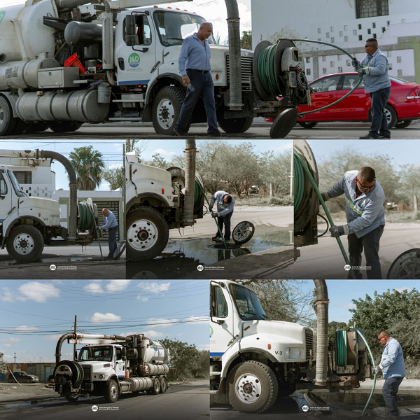 Como parte de estas acciones, personal del área de vactor de la Junta de Aguas y Drenajes, acudió a la colonia Leyes de Colonos, donde se realizaron trabajos de desazolve en las líneas de drenaje sanitario, atendiendo puntos con acumulación de aguas residuales.