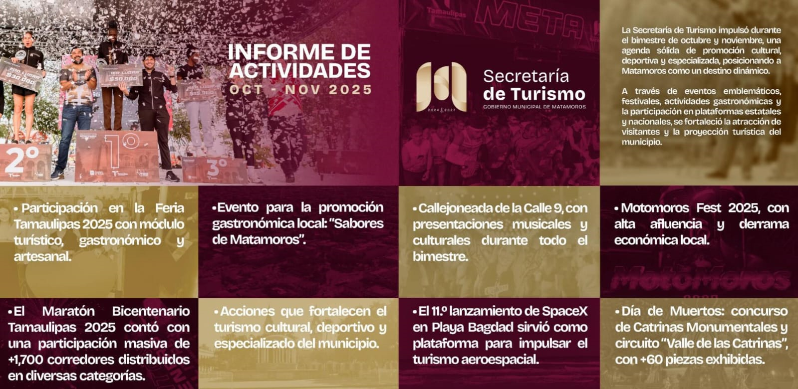 Mediante la coordinación de actividades culturales, deportivas y de promoción turística, esta dependencia ha logrado avances significativos en la atracción de visitantes y en la generación de derrama económica, reforzando la identidad de la ciudad bajo la visión del renacimiento Matamoros.