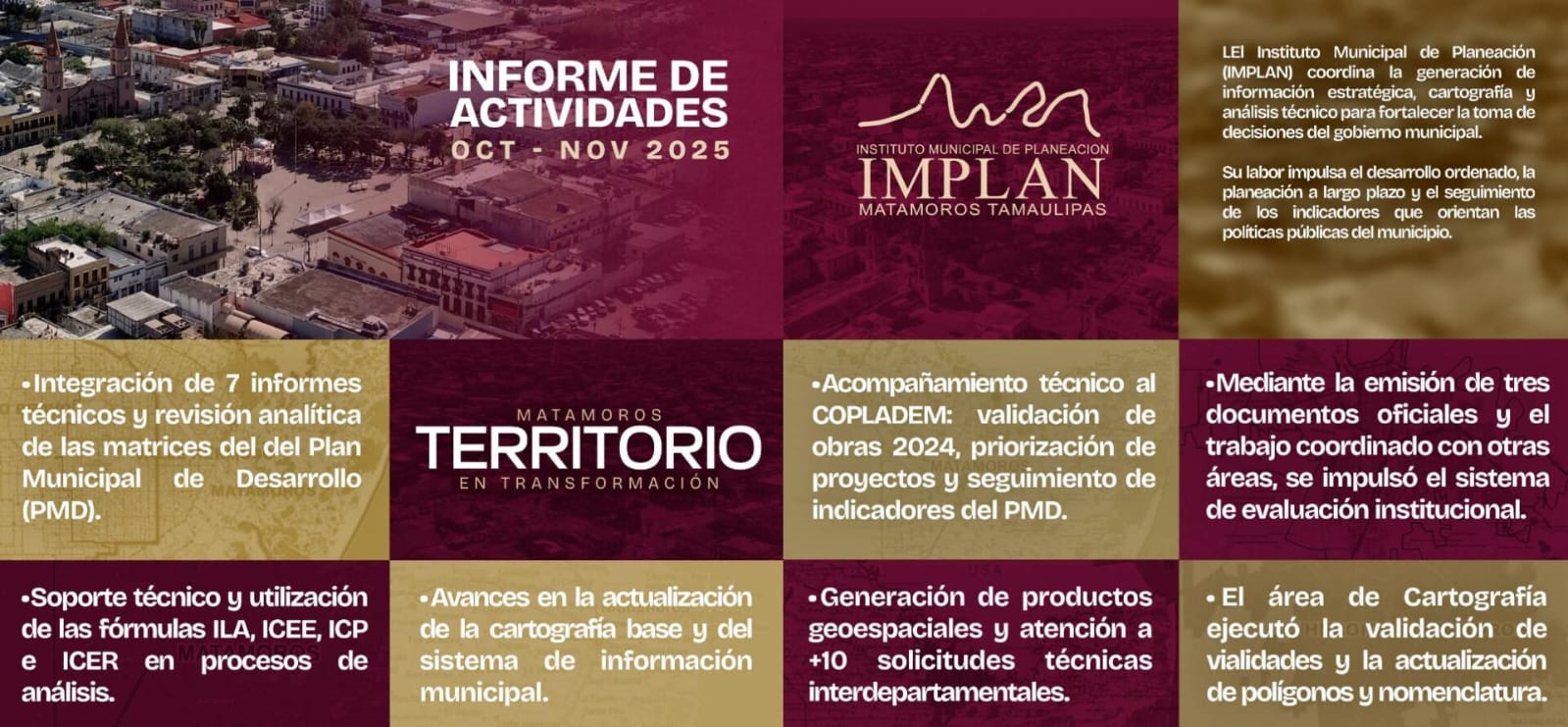 Matamoros, Tam.- El Gobierno de Beto Granados, a través del Instituto Municipal de Planeación (IMPLAN), coordinó la generación de información estratégica y cartográfica con el propósito de fortalecer la toma de decisiones del Gobierno Municipal, impulsando una gestión pública más eficiente, ordenada y basada en datos técnicos.