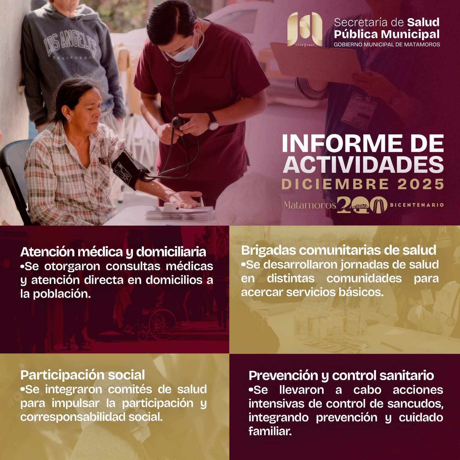 H. Matamoros, Tamaulipas.- El Gobierno Municipal que encabeza Beto Granados informó que durante el mes de diciembre la Secretaría de Salud Pública Municipal reforzó de manera significativa su presencia en diversas colonias de Matamoros, acercando servicios esenciales de salud a la población. Estas acciones reflejan una política pública enfocada en el bienestar social y en atender de forma directa las necesidades más sensibles de las familias matamorenses.
