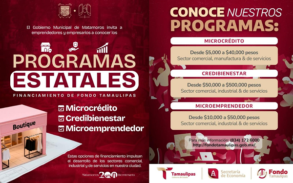 Estas alternativas forman parte de la coordinación entre el Gobierno del Estado de Tamaulipas, la Secretaría de Economía y Fondo Tamaulipas, sumándose a las acciones del Gobierno de Matamoros para impulsar el emprendimiento y el desarrollo productivo de la ciudad. Las personas interesadas pueden obtener mayor información comunicándose al (834) 172 6000 o consultando el sitio web fondotamaulipas.gob.mx.