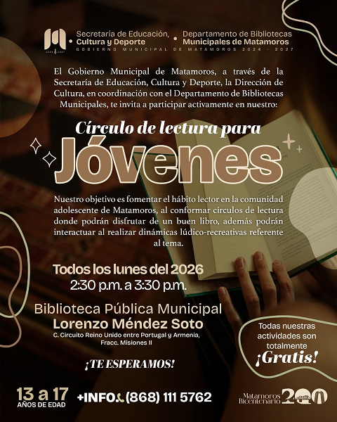 Matamoros, Tam.- El Gobierno de Beto Granados, a través de la Secretaría de Educación, Cultura y Deporte, la Dirección de Cultura y en coordinación con el Departamento de Bibliotecas Municipales, impulsa el Círculo de Lectura para Jóvenes, un programa enfocado en fomentar el hábito lector entre la comunidad adolescente de Matamoros.