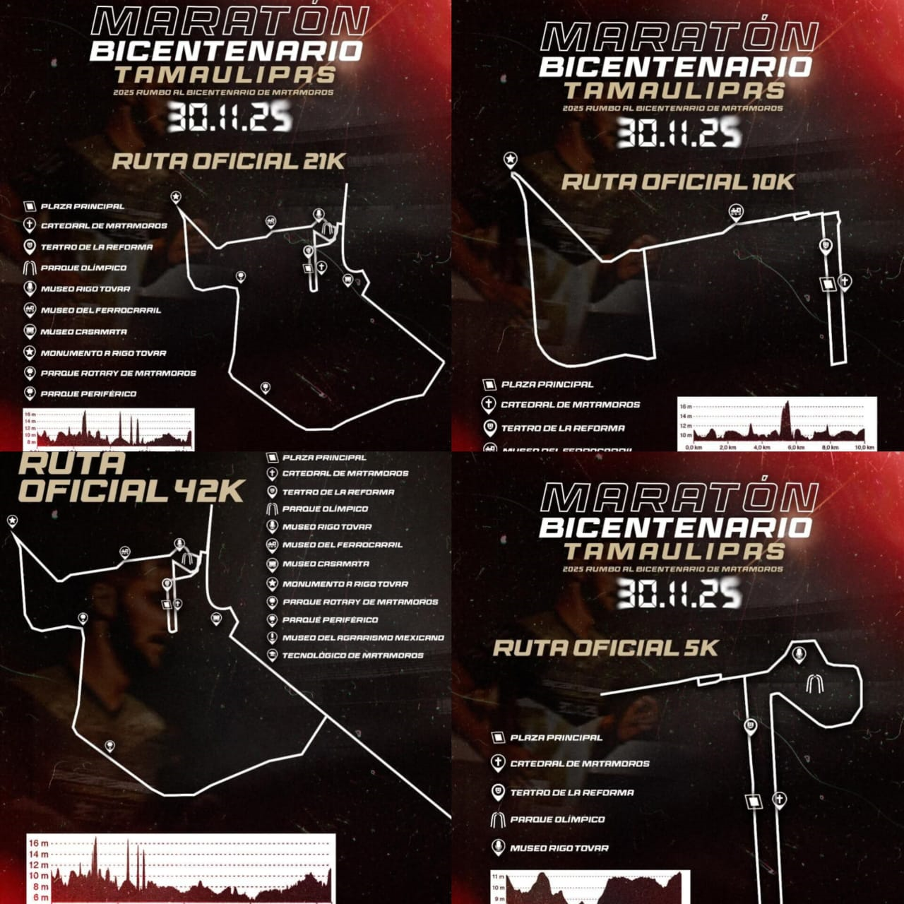 Para esta edición, se han definido cuatro distancias: 5K, 10K, 21K y 42K, cada una diseñada para recorrer algunos de los puntos más emblemáticos de la ciudad. Las rutas ofrecen una experiencia que combina actividad física, identidad matamorense y el orgullo de participar en un evento sin precedentes para la región.