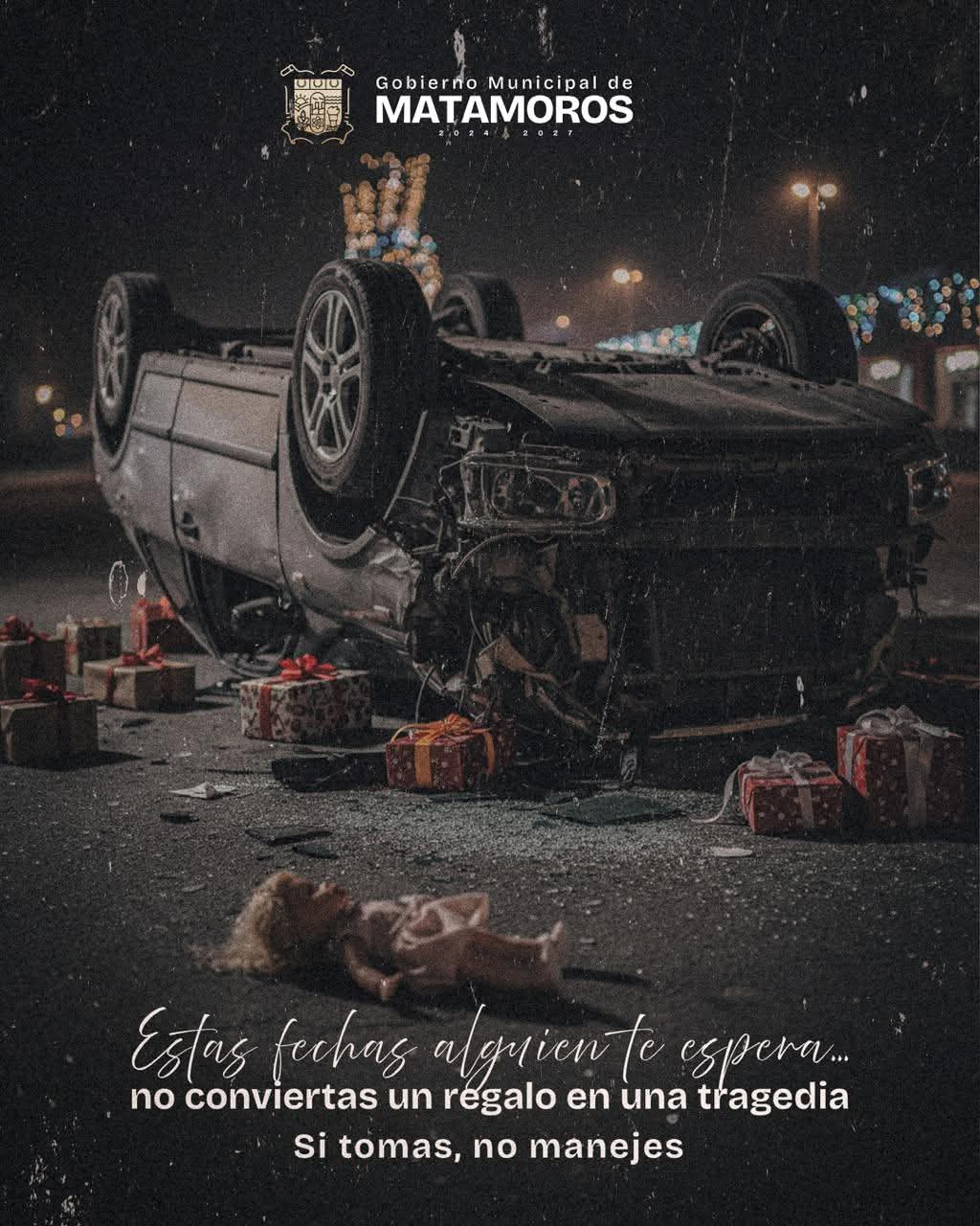 H. Matamoros, Tamaulipas.- El gobierno de Beto Granados emitió un mensaje de conciencia dirigido a la ciudadanía, con el objetivo de prevenir accidentes y tragedias durante las celebraciones navideñas. La administración municipal subrayó la importancia de actuar con responsabilidad, recordando que en estas fechas siempre hay alguien esperando el regreso seguro de sus seres queridos.