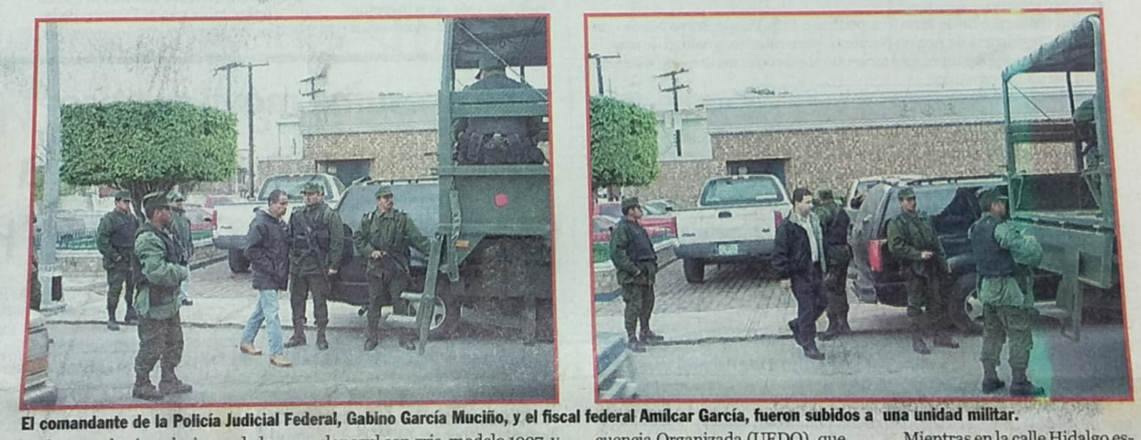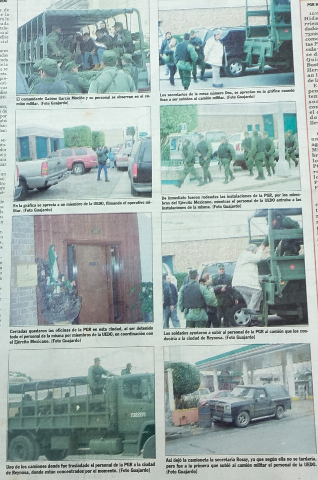 Un comando de élite de la Unidad Especializada contra la Delincuencia Organizada (UEDO) y dos camiones del Ejército Mexicano con matrículas 7322271 y 7306271, arribaron con 50 soldados bien armados a la calle Sexta e Iturbide, acordonaron toda la manzana; a las 11:05 de la mañana llegan dos camionetas Pick Up con placas 7111102 y 7412131, de las que descienden agentes de Inteligencia Militar e ingresan a la PGR.
