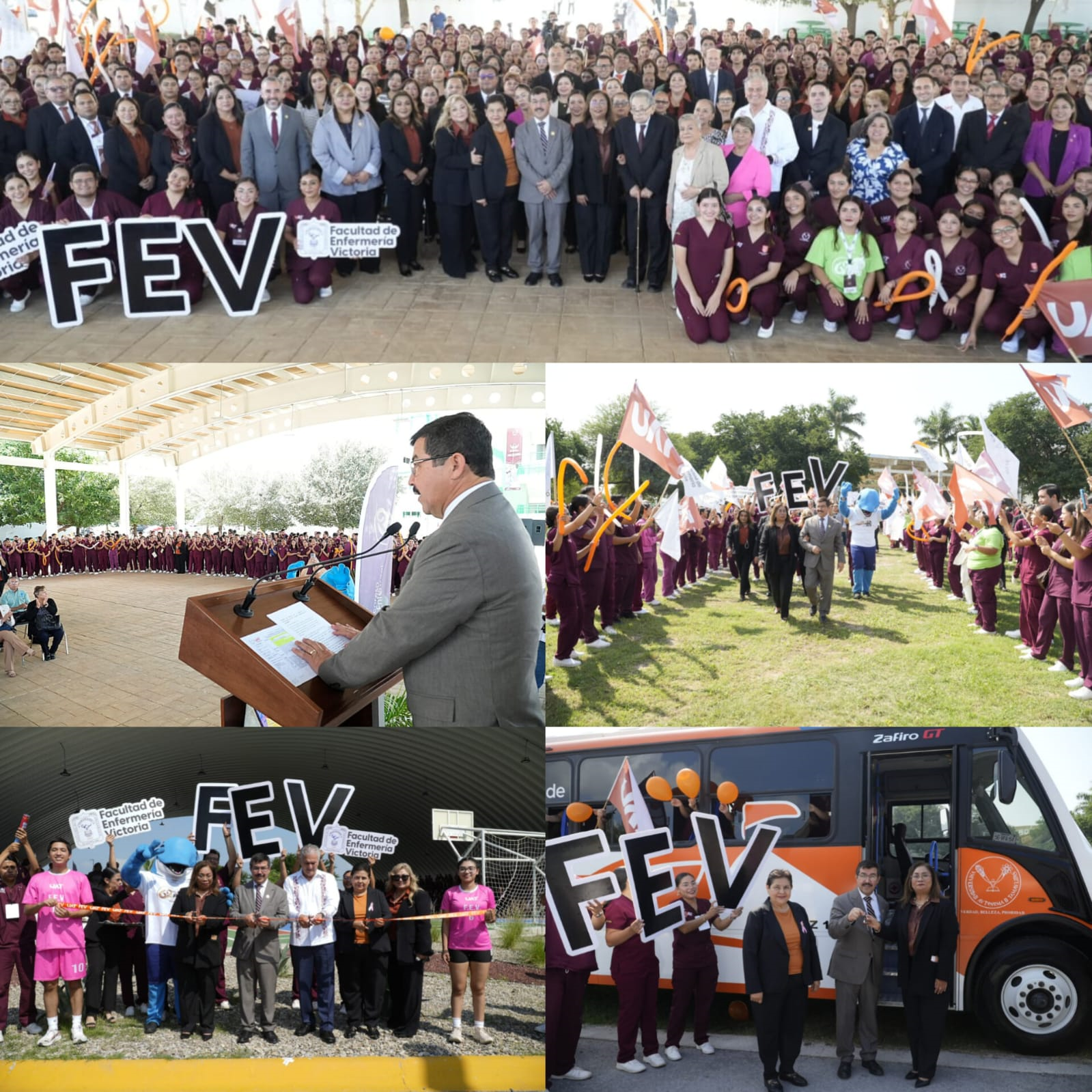 Durante su visita a la Facultad de Enfermería Victoria, el rector inauguró la techumbre monumental y la nueva cancha techada cuyos espacios serán de gran utilidad para las actividades cívicas, culturales y deportivas, así como también entregó una unidad de transporte para la comunidad estudiantil. Al evento asistió la subsecretaria de Enfermería y directora general adjunta de la Secretaría de Salud y Servicios de Salud de Tamaulipas, Irma Barragán Alvarado; funcionarios de la rectoría, autoridades y directoras de las facultades de Enfermería de la UAT; así como directivos y jefas de enfermería de hospitales; entre otros invitados.
