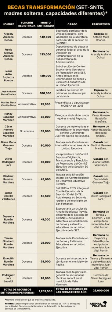 Los recursos fueron desviados a docentes que no cumplían los requisitos para recibir becas, entre ellos 20 integrantes de la cúpula de la Sección 30 del SNTE y sus familiares, que en realidad son “comisionados”; muy cercanos a Arnulfo Rodríguez Treviño y a su secretario particular, Ulises Ruíz Pérez, quien quiere heredar la dirigencia.