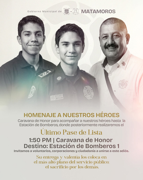 H. Matamoros, Tamaulipas.- El Gobierno Municipal de Matamoros, encabezado por el alcalde Beto Granados, informa que se llevará a cabo el último pase de lista en honor a los bomberos que perdieron la vida en el cumplimiento de su deber, como un acto solemne de respeto, memoria y reconocimiento a su valentía, entrega y vocación de servicio a la ciudadanía.