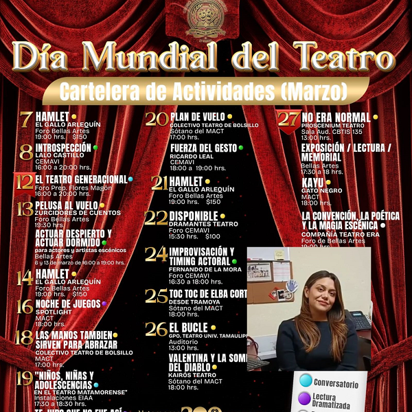 Invitó a que estén pendientes a las redes sociales de cultura y de Gobierno Municipal de Matamoros y que el próximo 27 de marzo se acerquen al teatro de La Reforma para el festejo del Día Internacional del Teatro.