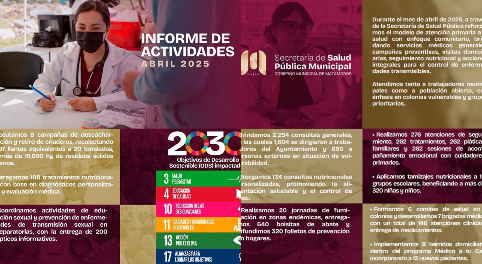 H. Matamoros, Tamaulipas.- El Gobierno de Matamoros, que preside Beto Granados, informó que la Secretaría de Salud Pública Municipal reforzó en abril su modelo de atención primaria con enfoque comunitario. Esta estrategia busca acercar servicios médicos, nutricionales y preventivos a la población, priorizando a los trabajadores del Ayuntamiento y a aquellos que se encuentran en situación vulnerable.