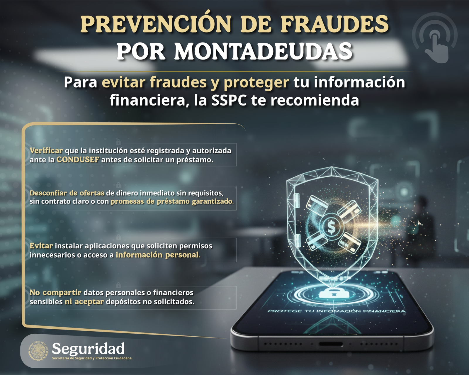 La Secretaría de Seguridad y Protección Ciudadana (SSPC), a través de la Unidad de Inteligencia, Investigación Cibernética y Operaciones Tecnológicas, emite recomendaciones a la ciudadanía para prevenir fraudes conocidos como montadeudas, durante el mes de enero, periodo caracterizado por una mayor presión económica derivada de gastos acumulados, pagos pendientes y menor liquidez.