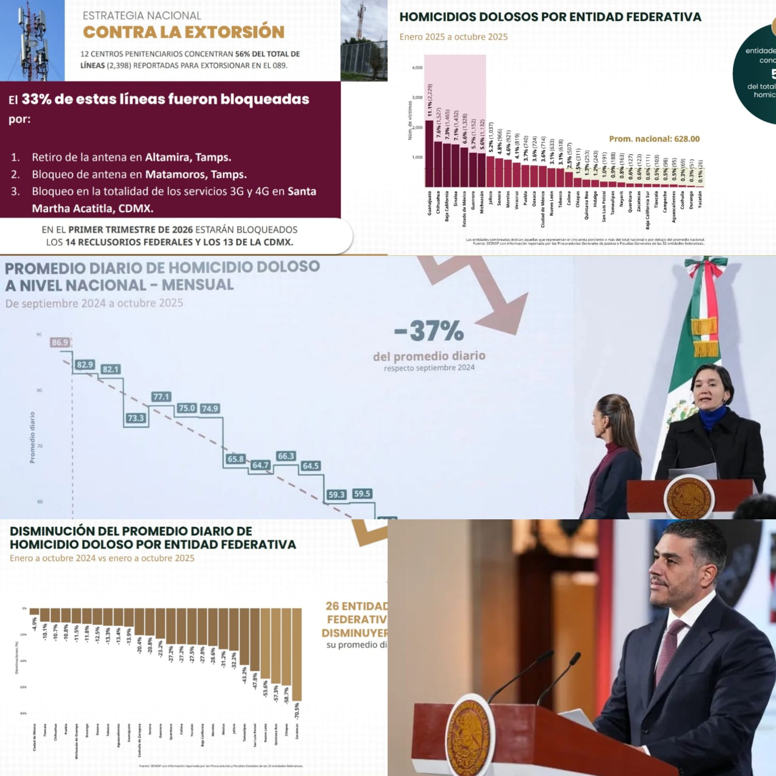 En su intervención, destacó que a nivel nacional el promedio diario de homicidios dolosos disminuyó 37% en octubre de 2025, en comparación con septiembre de 2024.