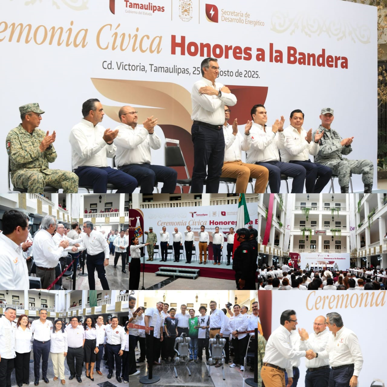 Acompañaron al gobernador en la ceremonia cívica: Humberto Prieto Herrera, presidente de la Junta de Gobierno del Congreso del Estado; Hernán De la Garza Tamez, presidente del Supremo Tribunal de Justicia; Héctor Joel Villegas González, secretario general de Gobierno; Francisco Adrián Cruz Martínez, presidente de la Mesa Directiva del Congreso; el general Enrique García Jaramillo, comandante de la 48 Zona Militar, y el comisario Adolfo Amparán Hernández, coordinador estatal de la Guardia Nacional, además de funcionarios del gabinete estatal, integrantes de la Mesa de Seguridad, diputadas y diputados locales y trabajadores del Gobierno del Estado.