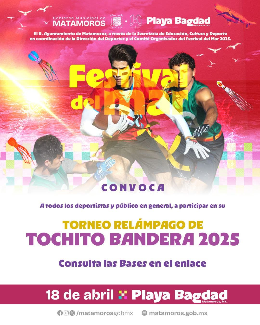 La invitación es para todos los deportistas y público en general en el torneo relámpago de tochito bandera 2025, a realizarse el próximo 18 de abril en la playa Bagdad de Matamoros dentro de la programación del Festival del mar 2025.