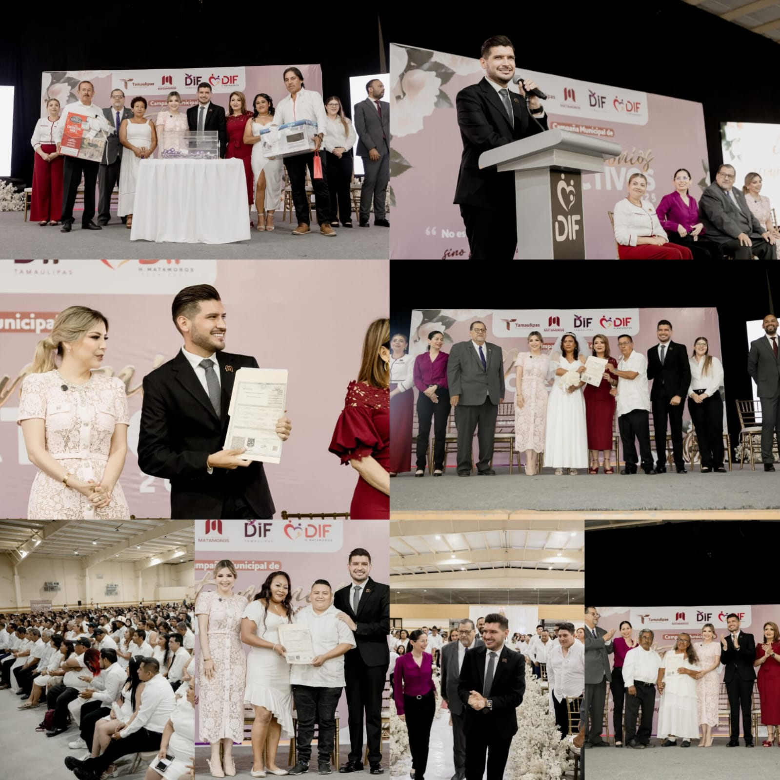 H. Matamoros, Tamaulipas.- Gracias a la coordinación entre el Gobierno del Estado, el Gobierno Municipal y el Sistema DIF Matamoros, presidido por Anita de Granados, quien estuvo acompañada por el alcalde, Beto Granados, cientos de parejas formalizaron su unión con certeza jurídica, en un ambiente lleno de alegría y celebración.